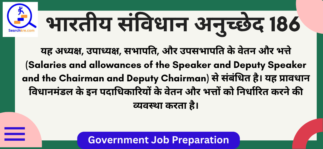 3. अनुच्छेद 186 के प्रमुख तत्व: वेतन और भत्ते: अध्यक्ष, उपाध्यक्ष, सभापति, और उपसभापति को वेतन और भत्ते मिलेंगे। इन्हें राज्य विधानमंडल द्वारा कानून के माध्यम से समय-समय पर निर्धारित किया जाएगा। राज्यपाल की भूमिका: यदि विधानमंडल द्वारा कोई कानून नहीं बनाया गया हो, तो राज्यपाल वेतन और भत्ते विनिर्दिष्ट करता है। उदाहरण: 2025 में, उत्तर प्रदेश विधानमंडल ने अपने अध्यक्ष और सभापति के लिए वेतन में संशोधन किया।