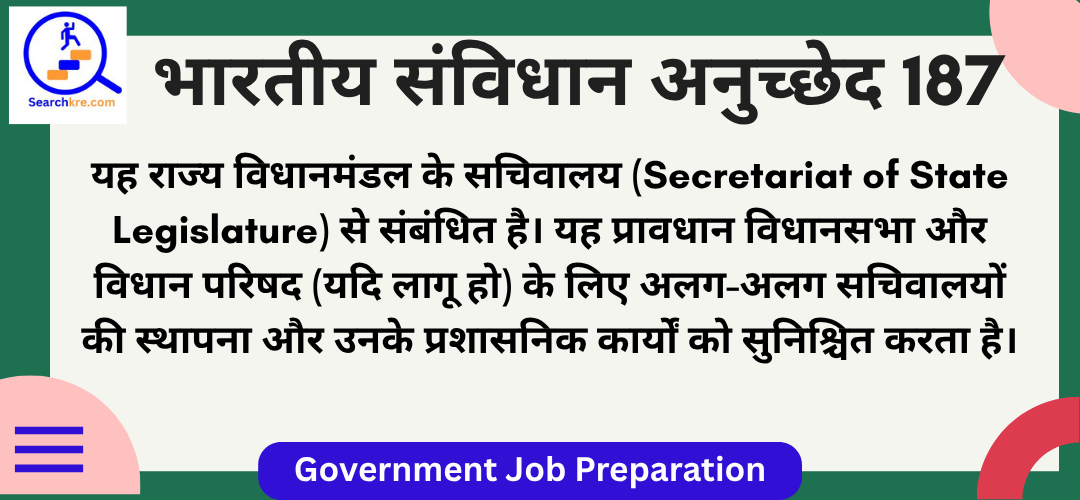 अनुच्छेद 187 भारतीय संविधान के भाग VI (राज्य) के अंतर्गत अध्याय III (राज्य का विधानमंडल) में आता है। यह राज्य विधानमंडल के सचिवालय (Secretariat of State Legislature) से संबंधित है। यह प्रावधान विधानसभा और विधान परिषद (यदि लागू हो) के लिए अलग-अलग सचिवालयों की स्थापना और उनके प्रशासनिक कार्यों को सुनिश्चित करता है।