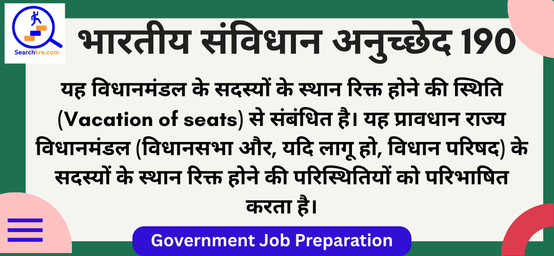 अनुच्छेद 190 भारतीय संविधान के भाग VI (राज्य) के अंतर्गत अध्याय III (राज्य का विधानमंडल) में आता है। यह विधानमंडल के सदस्यों के स्थान रिक्त होने की स्थिति (Vacation of seats) से संबंधित है। यह प्रावधान राज्य विधानमंडल (विधानसभा और, यदि लागू हो, विधान परिषद) के सदस्यों के स्थान रिक्त होने की परिस्थितियों को परिभाषित करता है।