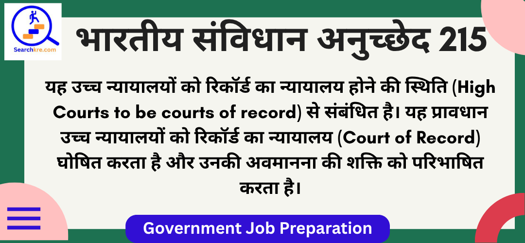 अनुच्छेद 215 भारतीय संविधान के भाग VI(राज्य) के अंतर्गत अध्याय V(राज्य में उच्च न्यायालय) में आता है। यह उच्च न्यायालयों को रिकॉर्ड का न्यायालय होने की स्थिति(High Courts to be courts of record) से संबंधित है। यह प्रावधान उच्च न्यायालयों को रिकॉर्ड का न्यायालय(Court of Record) घोषित करता है और उनकी अवमानना की शक्ति को परिभाषित करता है।