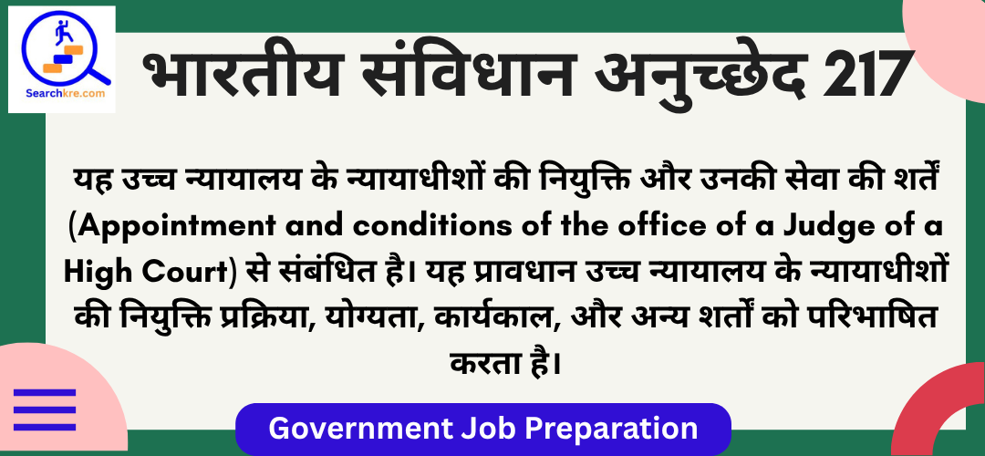 अनुच्छेद 217 भारतीय संविधान के भाग VI(राज्य) के अंतर्गत अध्याय V(राज्य में उच्च न्यायालय) में आता है। यह उच्च न्यायालय के न्यायाधीशों की नियुक्ति और उनकी सेवा की शर्तें(Appointment and conditions of the office of a Judge of a High Court) से संबंधित है। यह प्रावधान उच्च न्यायालय के न्यायाधीशों की नियुक्ति प्रक्रिया, योग्यता, कार्यकाल, और अन्य शर्तों को परिभाषित करता है।