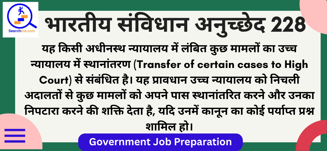 अनुच्छेद 228 भारतीय संविधान के भाग VI(राज्य) के अंतर्गत अध्याय V(राज्य में उच्च न्यायालय) में आता है। यह किसी अधीनस्थ न्यायालय में लंबित कुछ मामलों का उच्च न्यायालय में स्थानांतरण(Transfer of certain cases to High Court) से संबंधित है। यह प्रावधान उच्च न्यायालय को निचली अदालतों से कुछ मामलों को अपने पास स्थानांतरित करने और उनका निपटारा करने की शक्ति देता है, यदि उनमें कानून का कोई पर्याप्त प्रश्न शामिल हो।