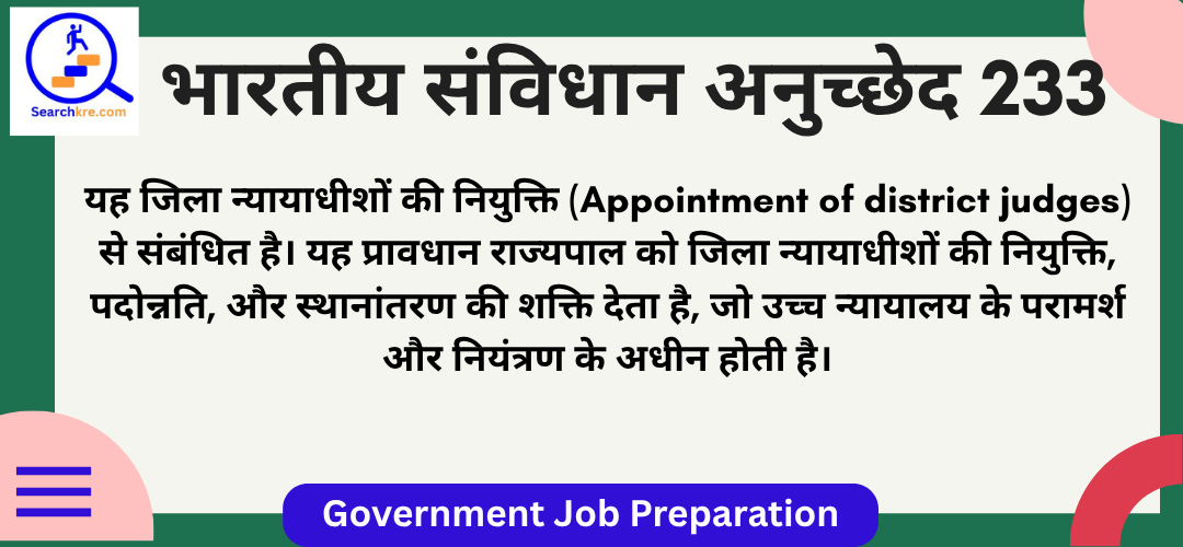 अनुच्छेद 233 भारतीय संविधान के भाग VI(राज्य) के अंतर्गत अध्याय VI(अधीनस्थ न्यायालय) में आता है। यह जिला न्यायाधीशों की नियुक्ति(Appointment of district judges) से संबंधित है। यह प्रावधान राज्यपाल को जिला न्यायाधीशों की नियुक्ति, पदोन्नति, और स्थानांतरण की शक्ति देता है, जो उच्च न्यायालय के परामर्श और नियंत्रण के अधीन होती है।