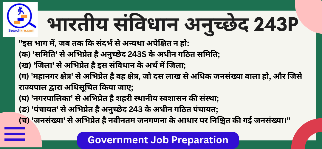 अनुच्छेद 243P भारतीय संविधान के भाग IX-A(नगरपालिकाएँ) में आता है। यह नगरपालिकाओं से संबंधित परिभाषाएँ(Definitions) प्रदान करता है। यह प्रावधान नगरपालिकाओं के गठन, संरचना, और कार्यों से संबंधित शब्दों को परिभाषित करता है, जो भाग IX-A के तहत शहरी स्थानीय शासन के लिए आधार बनाता है। यह अनुच्छेद 74वें संशोधन(1992) के द्वारा जोड़ा गया, जिसने नगरपालिकाओं को संवैधानिक दर्जा प्रदान किया।