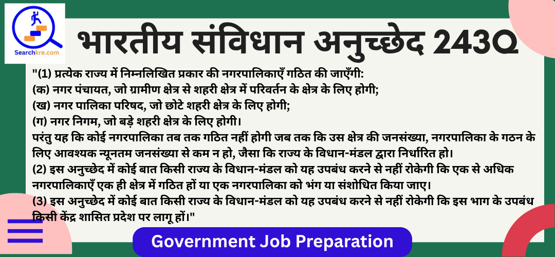 अनुच्छेद 243Q भारतीय संविधान के भाग IX-A(नगरपालिकाएँ) में आता है। यह नगरपालिकाओं का गठन(Constitution of Municipalities) से संबंधित है। यह प्रावधान शहरी क्षेत्रों में विभिन्न प्रकार की नगरपालिकाओं के गठन और उनकी संरचना को नियंत्रित करता है। यह अनुच्छेद 74वें संशोधन(1992) के द्वारा जोड़ा गया, जिसने शहरी स्थानीय निकायों को संवैधानिक दर्जा प्रदान किया।