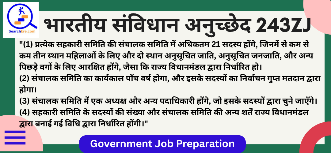 उद्देश्य: अनुच्छेद 243ZJ सहकारी समितियों की संचालक समिति की संरचना, सदस्यों की संख्या, और निर्वाचन प्रक्रिया को नियंत्रित करता है। यह महिलाओं और हाशिए के समुदायों(SC, ST, OBC) के लिए आरक्षण प्रदान करता है ताकि समावेशी प्रतिनिधित्व सुनिश्चित हो। इसका लक्ष्य सहकारी समितियों में लोकतांत्रिक प्रबंधन, पारदर्शिता, और सामाजिक न्याय को बढ़ावा देना है, साथ ही संघीय ढांचे में उनकी स्वायत्तता को संरक्षित करना है।