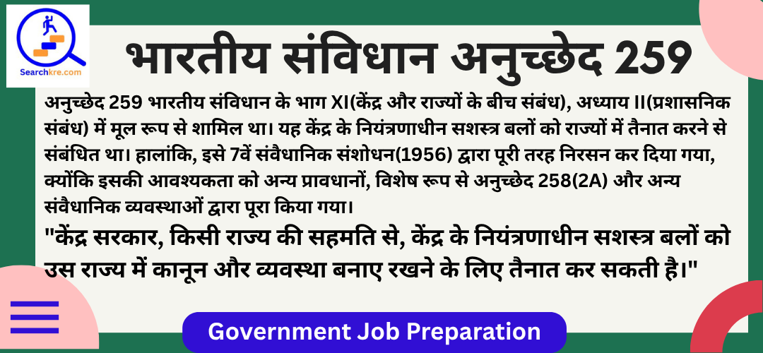 अनुच्छेद 259 भारतीय संविधान के भाग XI(केंद्र और राज्यों के बीच संबंध), अध्याय II(प्रशासनिक संबंध) में मूल रूप से शामिल था। यह केंद्र के नियंत्रणाधीन सशस्त्र बलों को राज्यों में तैनात करने से संबंधित था। हालांकि, इसे 7वें संवैधानिक संशोधन(1956) द्वारा पूरी तरह निरसन कर दिया गया, क्योंकि इसकी आवश्यकता को अन्य प्रावधानों, विशेष रूप से अनुच्छेद 258(2A) और अन्य संवैधानिक व्यवस्थाओं द्वारा पूरा किया गया।