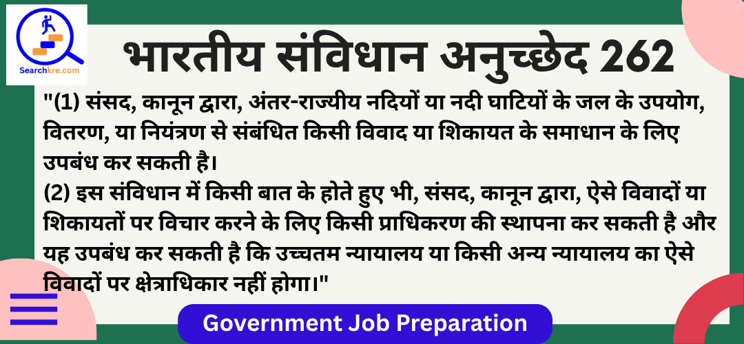 अनुच्छेद 262 भारतीय संविधान के भाग XI(केंद्र और राज्यों के बीच संबंध) के अध्याय II(प्रशासनिक संबंध) में आता है। यह अंतर-राज्यीय नदियों और नदी घाटियों से संबंधित विवादों(Adjudication of disputes relating to waters of inter-State rivers or river valleys) से संबंधित है। यह प्रावधान संसद को अंतर-राज्यीय नदियों और नदी घाटियों के जल विवादों को हल करने के लिए कानून बनाने और ऐसे विवादों पर न्यायिक क्षेत्राधिकार को सीमित करने की शक्ति देता है।
