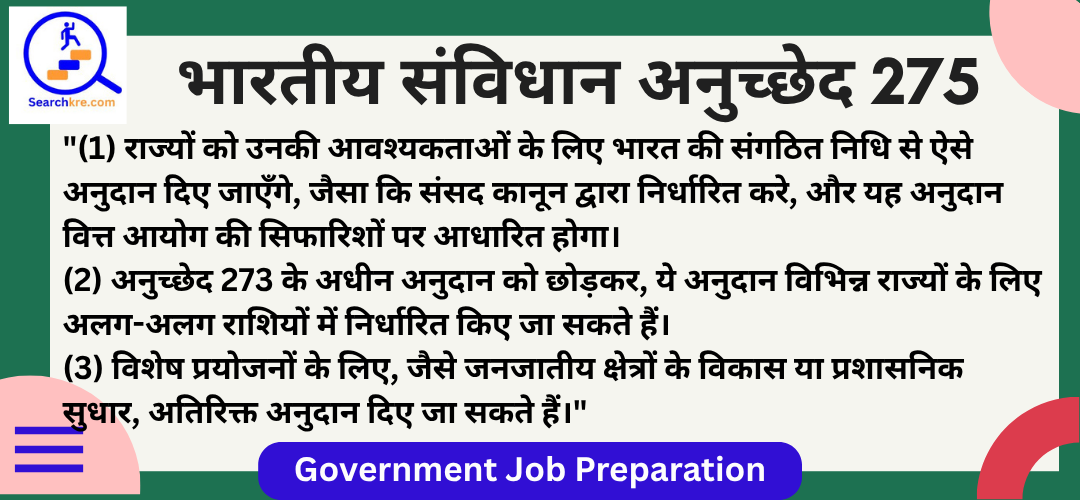 अनुच्छेद 275 भारतीय संविधान के भाग XII(वित्त, संपत्ति, संविदाएँ और वाद) के अध्याय I(वित्त) में आता है। यह राज्यों को अनुदान(Grants-in-aid to States) से संबंधित है, जो केंद्र सरकार द्वारा राज्यों की वित्तीय आवश्यकताओं को पूरा करने के लिए प्रदान किए जाते हैं। यह प्रावधान केंद्र से राज्यों को वित्तीय सहायता प्रदान करने की व्यवस्था करता है, विशेष रूप से उन राज्यों के लिए जो आर्थिक रूप से कमजोर हैं या जिन्हें विशेष सहायता की आवश्यकता है।