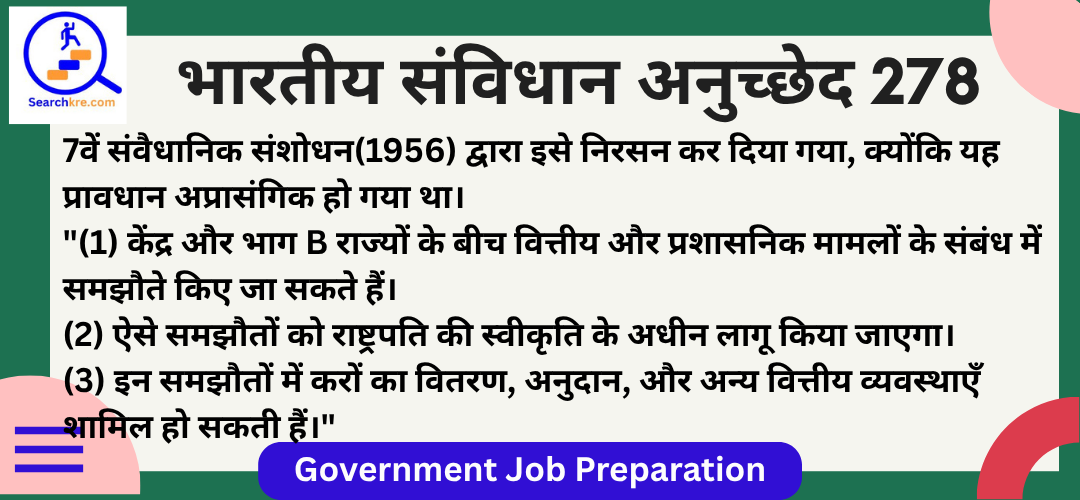 अनुच्छेद 278 भारतीय संविधान के भाग XII(वित्त, संपत्ति, संविदाएँ और वाद) के अध्याय I(वित्त) में था। यह केंद्र और राज्यों के बीच समझौतों(Agreements between the Union and States) से संबंधित था, जो केंद्र और तत्कालीन भाग B राज्यों(पूर्ववर्ती रियासतों) के बीच वित्तीय और प्रशासनिक व्यवस्थाओं के लिए बनाए गए थे। यह प्रावधान संविधान लागू होने के बाद इन राज्यों के एकीकरण को सुगम बनाने के लिए था। हालांकि, 7वें संवैधानिक संशोधन(1956) द्वारा इसे निरसन कर दिया गया, क्योंकि यह प्रावधान अप्रासंगिक हो गया था।
