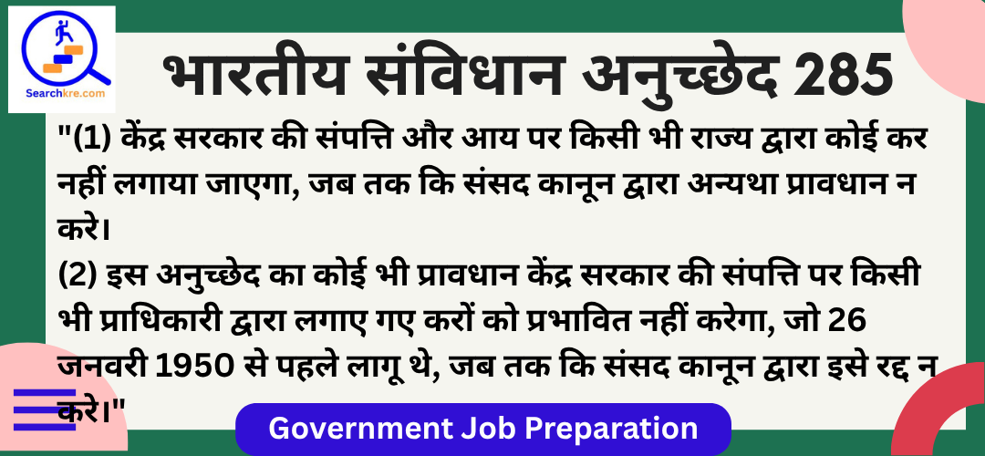 अनुच्छेद 285 भारतीय संविधान के भाग XII(वित्त, संपत्ति, संविदाएँ और वाद) के अध्याय I(वित्त) में आता है। यह केंद्र सरकार की संपत्ति पर राज्य के कराधान से छूट(Exemption of Union property from State taxation) से संबंधित है। यह प्रावधान केंद्र सरकार की संपत्ति को राज्यों द्वारा लगाए गए करों से छूट प्रदान करता है, जब तक कि संसद कानून द्वारा अन्यथा प्रावधान न करे।