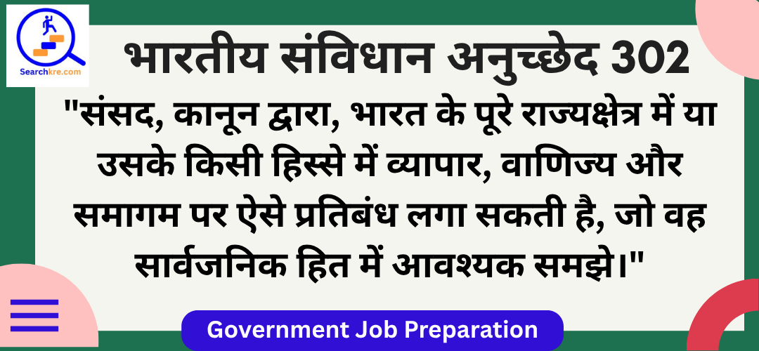 अनुच्छेद 302 भारतीय संविधान के भाग XIII (भारत के राज्यक्षेत्र के भीतर व्यापार, वाणिज्य और समागम) में आता है। यह संसद की व्यापार, वाणिज्य और समागम पर प्रतिबंध लगाने की शक्ति (Power of Parliament to impose restrictions on trade, commerce, and intercourse) से संबंधित है। यह प्रावधान संसद को भारत के पूरे राज्यक्षेत्र में या उसके किसी हिस्से में व्यापार, वाणिज्य, और समागम पर प्रतिबंध लगाने की शक्ति देता है, बशर्ते यह सार्वजनिक हित में हो।