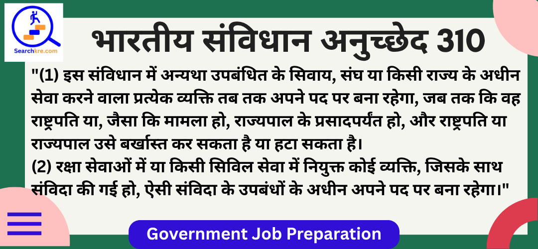 अनुच्छेद 310 भारतीय संविधान के भाग XIV (संघ और राज्यों के अधीन सेवाएँ) में आता है। यह संघ और राज्यों के अधीन व्यक्तियों की सेवा की अवधि (Tenure of office of persons serving the Union or a State) से संबंधित है। यह प्रावधान सिविल सेवकों और अन्य सरकारी कर्मचारियों की सेवा की अवधि को नियंत्रित करता है, जिसमें यह निर्धारित किया गया है कि वे अपनी सेवा के दौरान राष्ट्रपति या राज्यपाल के प्रसादपर्यंत (pleasure) पद पर बने रहते हैं।