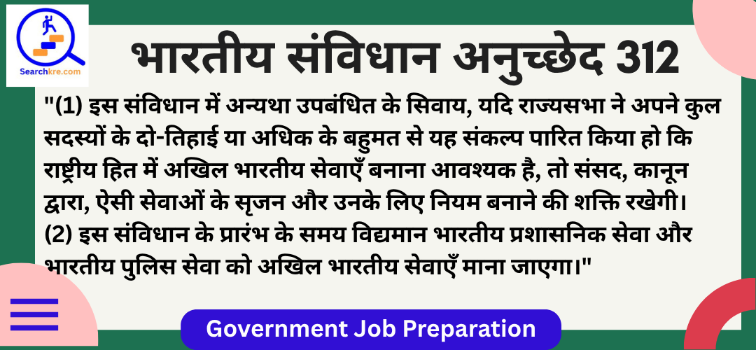 अनुच्छेद 312 भारतीय संविधान के भाग XIV (संघ और राज्यों के अधीन सेवाएँ) में आता है। यह अखिल भारतीय सेवाओं (All India Services) से संबंधित है। यह प्रावधान संसद को अखिल भारतीय सेवाएँ (जैसे, IAS, IPS, IFS) बनाने और उनके लिए नियम बनाने की शक्ति देता है, साथ ही यह सुनिश्चित करता है कि इन सेवाओं की स्थापना के लिए राज्यसभा की सहमति आवश्यक हो।