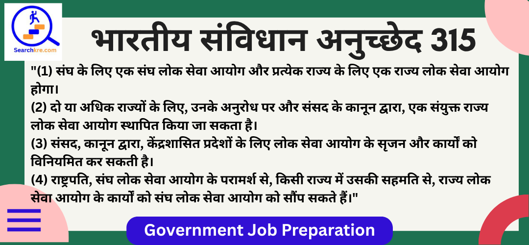 अनुच्छेद 315 भारतीय संविधान के भाग XIV (संघ और राज्यों के अधीन सेवाएँ) में आता है। यह संघ और राज्यों के लिए लोक सेवा आयोग (Public Service Commissions for the Union and for the States) से संबंधित है। यह प्रावधान संघ लोक सेवा आयोग (UPSC) और प्रत्येक राज्य के लिए राज्य लोक सेवा आयोग (SPSC) की स्थापना और उनके कार्यों को नियंत्रित करता है।