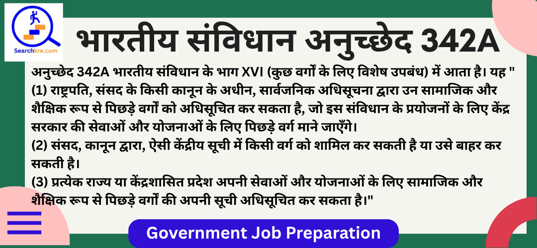 अनुच्छेद 342A भारतीय संविधान के भाग XVI (कुछ वर्गों के लिए विशेष उपबंध) में आता है। यह "(1) राष्ट्रपति, संसद के किसी कानून के अधीन, सार्वजनिक अधिसूचना द्वारा उन सामाजिक और शैक्षिक रूप से पिछड़े वर्गों को अधिसूचित कर सकता है, जो इस संविधान के प्रयोजनों के लिए केंद्र सरकार की सेवाओं और योजनाओं के लिए पिछड़े वर्ग माने जाएँगे।