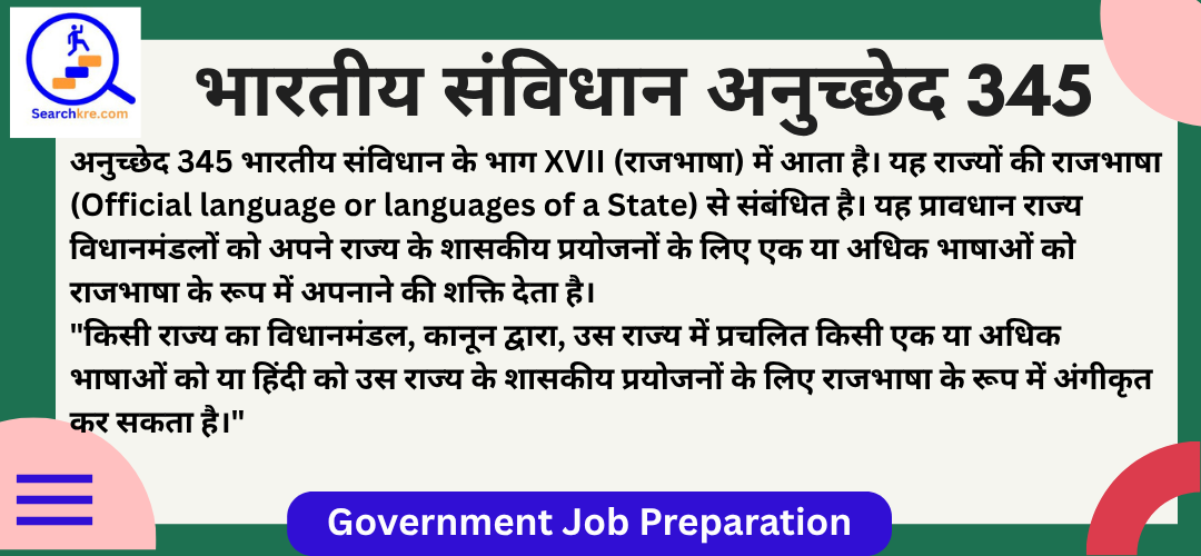 अनुच्छेद 345 भारतीय संविधान के भाग XVII (राजभाषा) में आता है। यह राज्यों की राजभाषा (Official language or languages of a State) से संबंधित है। यह प्रावधान राज्य विधानमंडलों को अपने राज्य के शासकीय प्रयोजनों के लिए एक या अधिक भाषाओं को राजभाषा के रूप में अपनाने की शक्ति देता है।