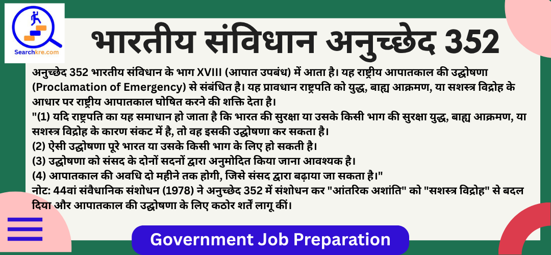 अनुच्छेद 352 भारतीय संविधान के भाग XVIII (आपात उपबंध) में आता है। यह राष्ट्रीय आपातकाल की उद्घोषणा (Proclamation of Emergency) से संबंधित है। यह प्रावधान राष्ट्रपति को युद्ध, बाह्य आक्रमण, या सशस्त्र विद्रोह के आधार पर राष्ट्रीय आपातकाल घोषित करने की शक्ति देता है।