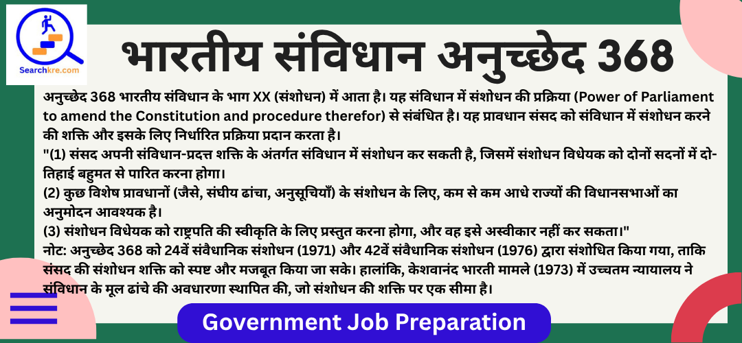 अनुच्छेद 368 भारतीय संविधान के भाग XX (संशोधन) में आता है। यह संविधान में संशोधन की प्रक्रिया (Power of Parliament to amend the Constitution and procedure therefor) से संबंधित है। यह प्रावधान संसद को संविधान में संशोधन करने की शक्ति और इसके लिए निर्धारित प्रक्रिया प्रदान करता है।