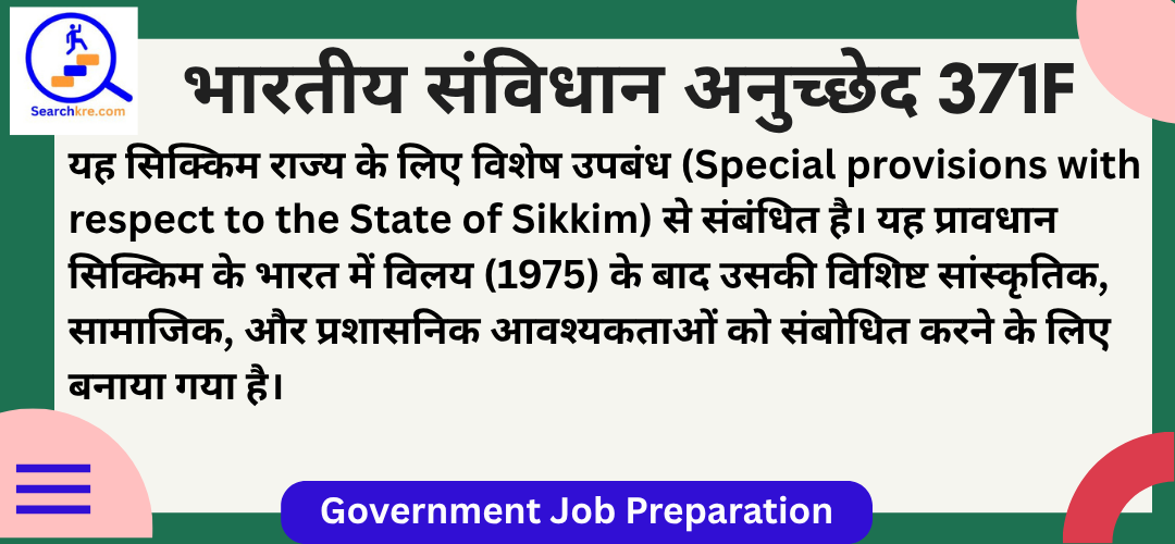 अनुच्छेद 371F भारतीय संविधान के भाग XXI (अस्थायी, संक्रमणकालीन और विशेष उपबंध) में आता है। यह सिक्किम राज्य के लिए विशेष उपबंध (Special provisions with respect to the State of Sikkim) से संबंधित है। यह प्रावधान सिक्किम के भारत में विलय (1975) के बाद उसकी विशिष्ट सांस्कृतिक, सामाजिक, और प्रशासनिक आवश्यकताओं को संबोधित करने के लिए बनाया गया है।