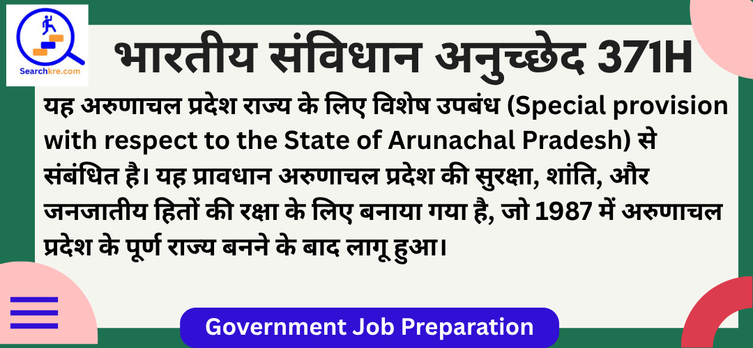 अनुच्छेद 371H भारतीय संविधान के भाग XXI (अस्थायी, संक्रमणकालीन और विशेष उपबंध) में आता है। यह अरुणाचल प्रदेश राज्य के लिए विशेष उपबंध (Special provision with respect to the State of Arunachal Pradesh) से संबंधित है। यह प्रावधान अरुणाचल प्रदेश की सुरक्षा, शांति, और जनजातीय हितों की रक्षा के लिए बनाया गया है, जो 1987 में अरुणाचल प्रदेश के पूर्ण राज्य बनने के बाद लागू हुआ।