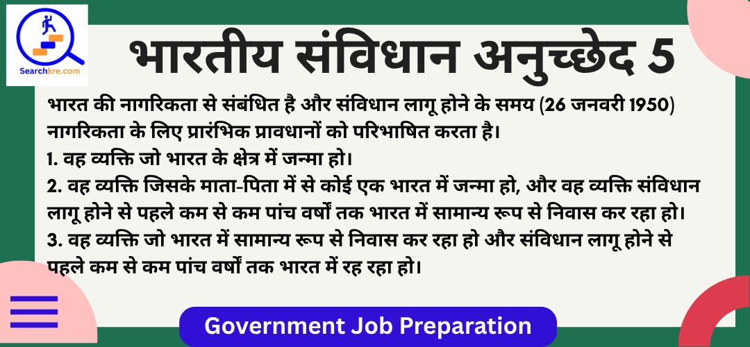 भारतीय संविधान का अनुच्छेद 5: भारत की नागरिकता से संबंधित है और संविधान लागू होने के समय (26 जनवरी 1950) नागरिकता के लिए प्रारंभिक प्रावधानों को परिभाषित करता है।