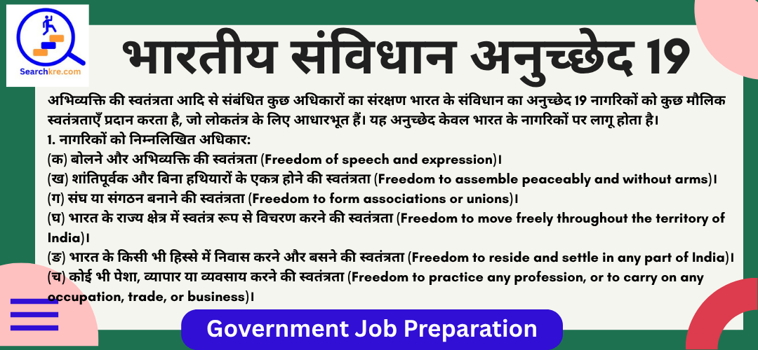 भारतीय संविधान का अनुच्छेद 19: अभिव्यक्ति की स्वतंत्रता आदि से संबंधित कुछ अधिकारों का संरक्षण भारत के संविधान का अनुच्छेद 19 नागरिकों को कुछ मौलिक स्वतंत्रताएँ प्रदान करता है, जो लोकतंत्र के लिए आधारभूत हैं। यह अनुच्छेद केवल भारत के नागरिकों पर लागू होता है। इसके प्रावधान निम्नलिखित हैं